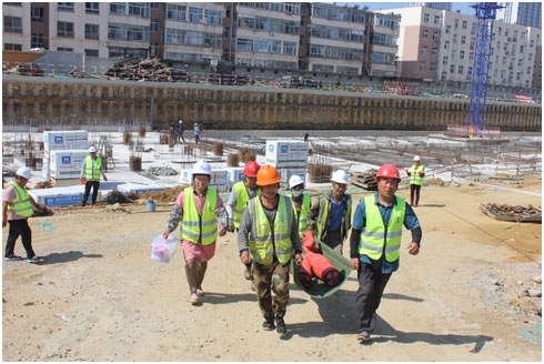 本次演練模擬為施工現(xiàn)場材料堆場出現(xiàn)火情和坍塌,施工人員發(fā)現(xiàn)后立即向項目經(jīng)理報告,項目經(jīng)理根據(jù)現(xiàn)場情況立即啟動應(yīng)急預(yù)案。項目部全員按照應(yīng)急預(yù)案進行疏散逃生。醫(yī)療救護組、安保組、綜合協(xié)調(diào)組等迅速集結(jié),在做了緊急部署后,搶救傷員、滅火行動組同步行動,整個演練井然有序進行。